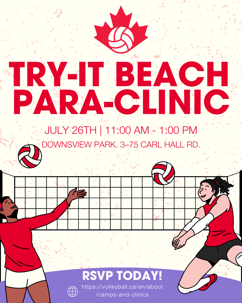 Volleyball Canada is hosting a Beach Standing Para-Volleyball clinic on July 26th from 11am to 1pm at the Beach High Performance Centre in Toronto.